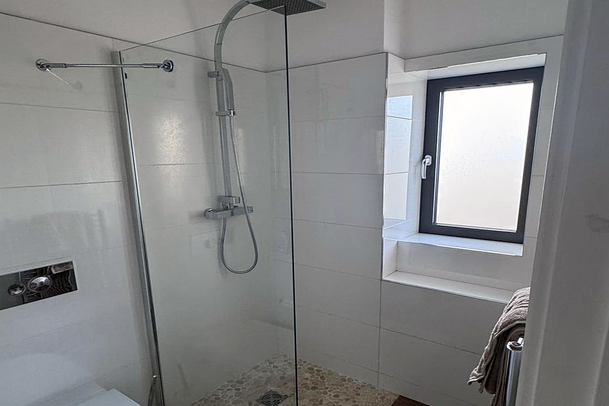 The heated swimming pool is 10m x 5m and at its deepest 1.8m. Around the pool you'll find sun loungers and a parasol. Modern, glass railings take nothing from the view to the sea beyond.