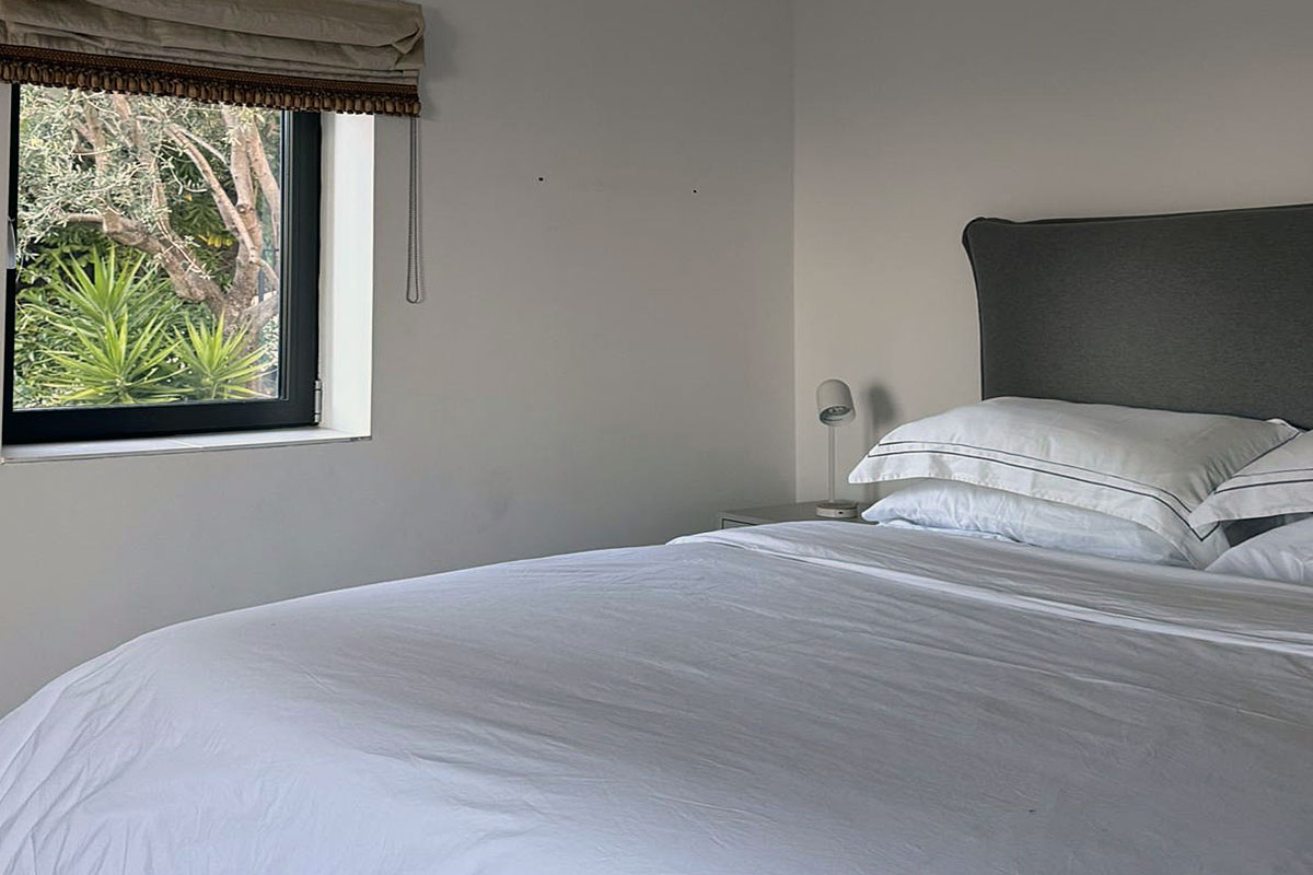 The entrance to the villa is on the ground floor which leads to the kitchen, living room and dining rooms and onto the dining and pool terraces. The Bo Concept dining table sits 10 people. With high quality furnishings, a 72' smart television with international channels and a music system inside the villa and out, it's a holiday home for discerning guests.
