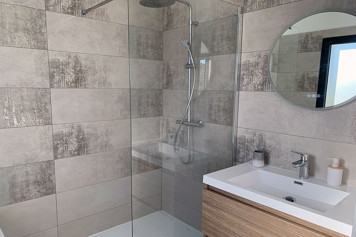 Bedroom 2 - 160cm bed, door with electric shutters out to the pool. The ensuite shower room, is a Jack and Jill style with bedroom 3. On entering from either side, each room has its own wash basin and the shower is in the middle.
