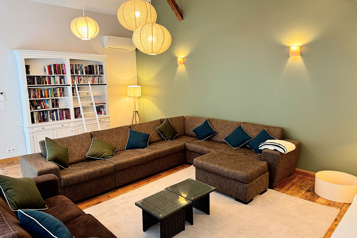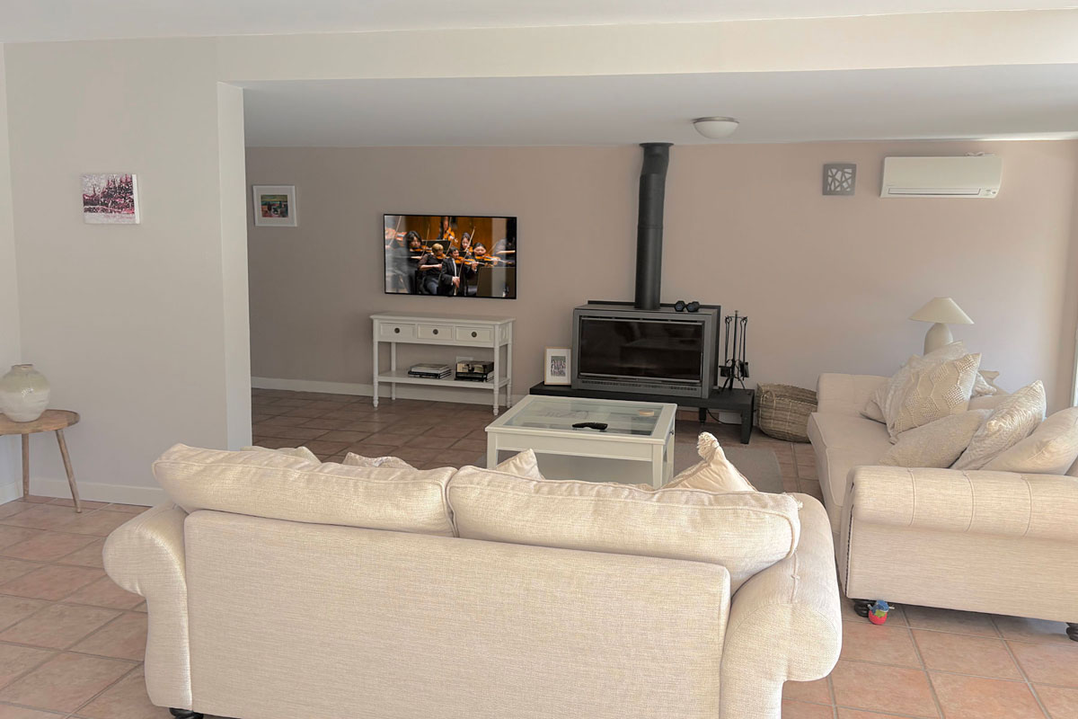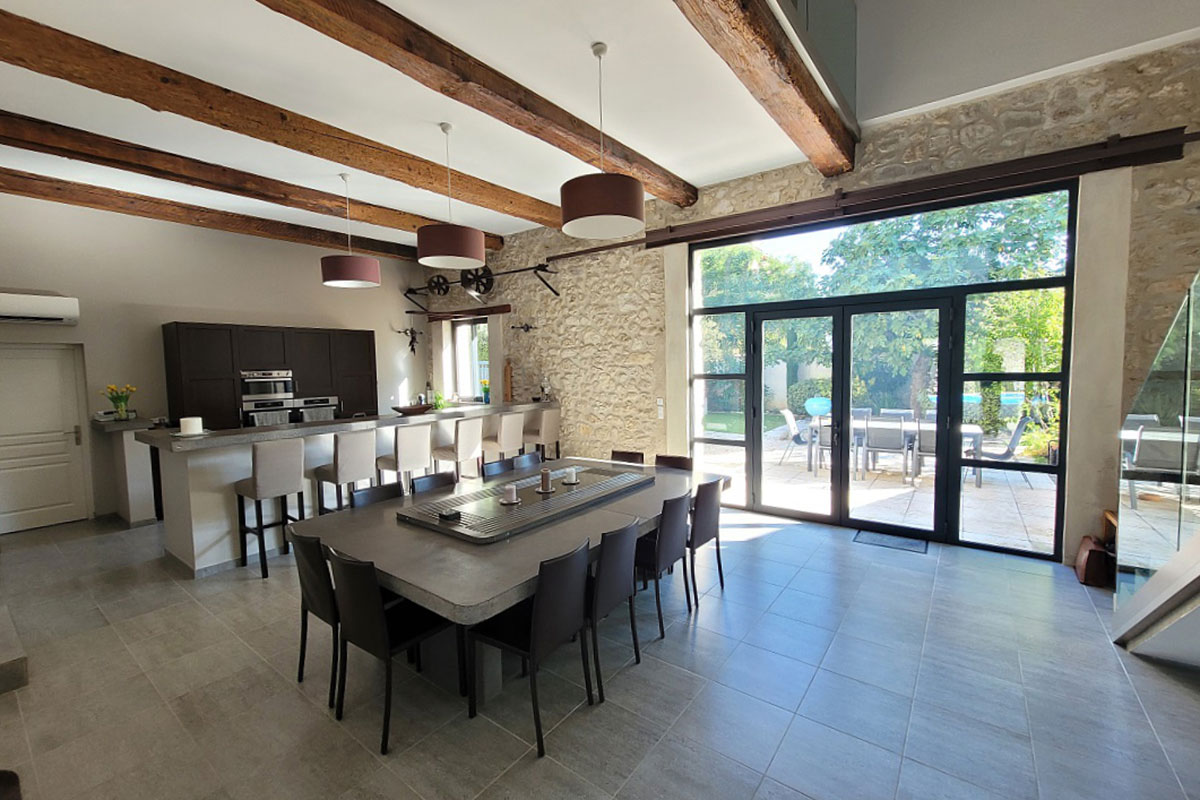 The very spacious villa features 4 air-conditioned bedrooms and 3 stylish shower rooms, offering plenty of room for families or groups of friends. The open-plan living area boasts exposed beams, high ceilings, and large windows that fill the space with natural light. The fully equipped kitchen and generous dining area make it easy to enjoy relaxed meals together.