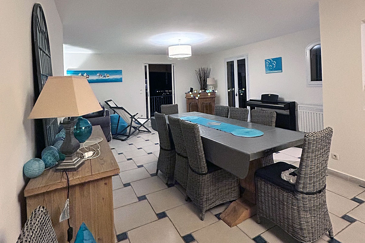 The living area has comfortable sofas, an electric piano, dining table, table football, and a bar. French doors lead to the long South facing terrace which has a dining table and an outdoor sofa, ideal for an evening aperitif.