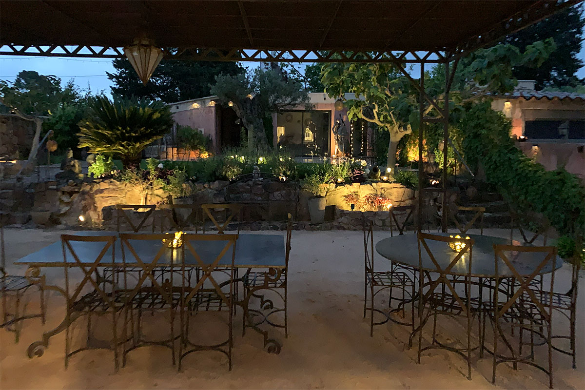 The garden and terrace on the kitchen side of the villa has 3 dining tables under a wrought iron pergola.